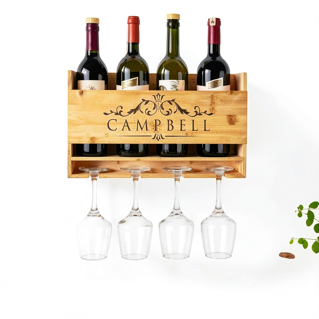 The Personalization Lab Engraved Wine Rack is a sophisticated storage solution made from high-quality bamboo, featuring dimensions of 3.75 inches deep, 15.75 inches wide, and 9.5 inches high. This unfinished wooden rack securely holds 4 standard wine bottles and 4 wine glasses, combining functionality with a customizable engraved design. It requires no assembly and includes wall-mount keyholes for easy installation, making it a durable and stylish addition to any home.